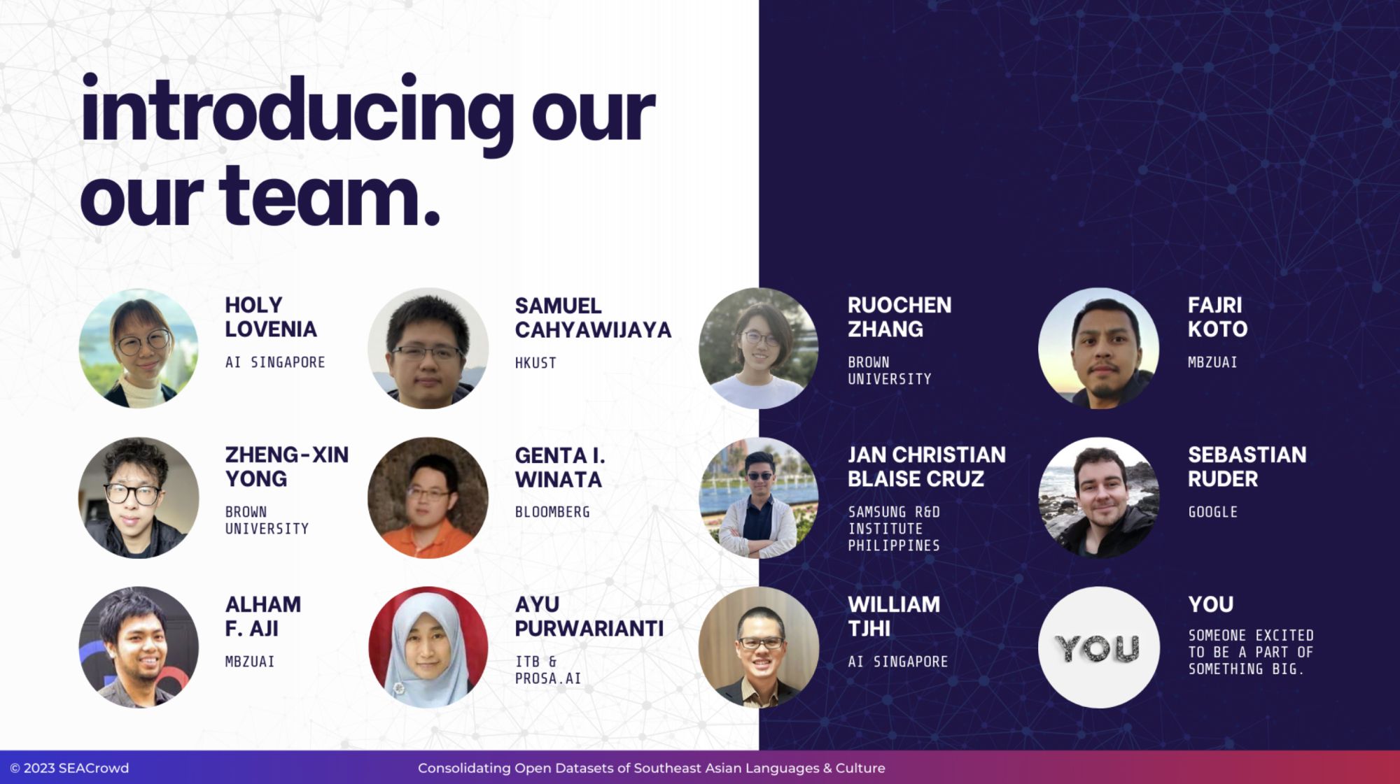 Big thanks to our wonderful contributors who have dedicated their time, energy, and effort to grow SEACrowd. None of this could have happened without them. 💕 Special appreciation for Sonny Lazuardi , who has designed, developed, and maintained this beautiful catalogue.